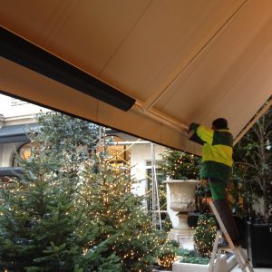 Réalisation avec un partenaire storiste Parisien de l’installation de 3 chauffages HEATSTRIP 3200 MHS par store dans un Hôtel de luxe Parisien. Le store se déplie avec les chauffages infrarouges Heatstrip fixés à l’extrémité du store et sont orientés vers les clients de manière à rechercher l’efficacité optimale. Cette installation est très discrète, même avec les chauffages en marche, car ils n’émettent aucune lumière.