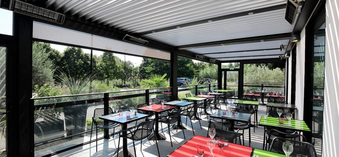 Pergola avec des chauffes terrasses infrarouge Heatscope modèle SPOT 2800w